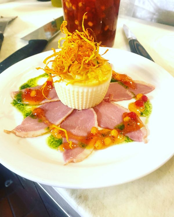 Sweet pea pesto, toasted pistachio, verdure croccanti, crema di balsamico and virgin olive oil