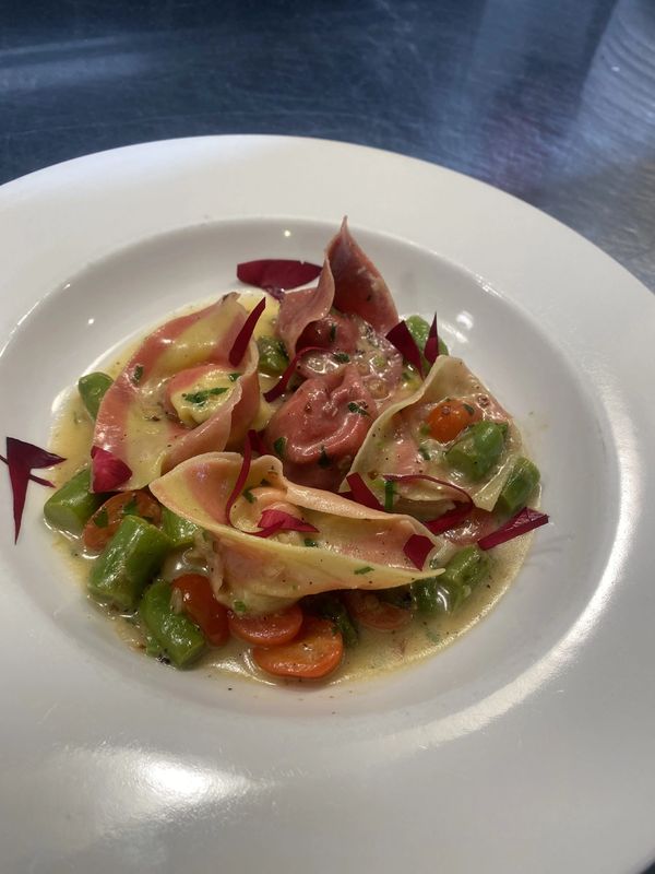 Handmade tortellonis filled with piselli, zucchini ricotta, with verdure croccanti, tomato concasse, herb fonduta