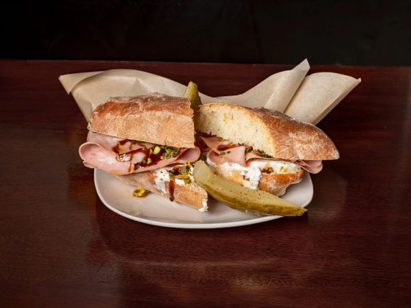 Prosciutto cotto, muenster, pepperocino, spicy eggplant, arugula, crema di balsamico